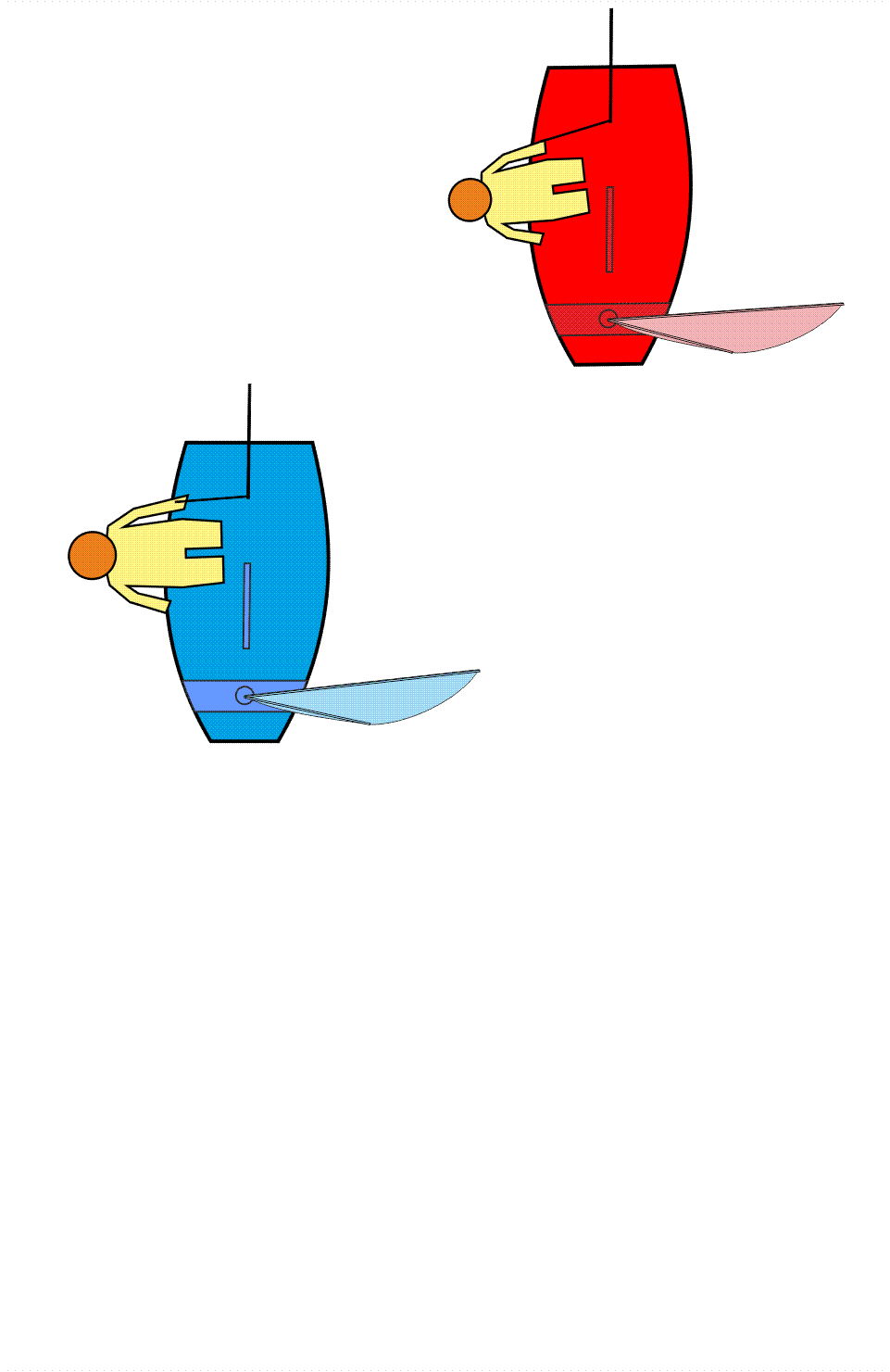 Zur nächsten Bahnmarke ist ein direkter Vorwindkurs. Rot stellt von klar achteraus in einer Bootslänge Abstand eine Überlappung in Lee von Blau her. Dann luvt Rot langsam.