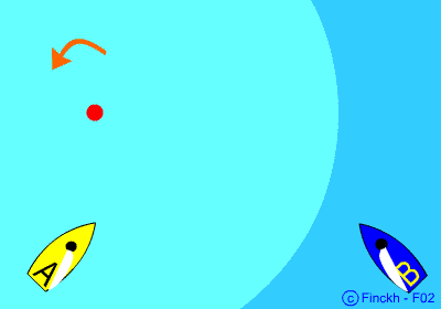 | B fällt innerhalb der Zone ab, kann aber die Bahnmarke anliegen. A geht in der Zone von Backbordschlag auf Steuerbordschlag durch den Wind. Dabei zwingt es B dazu höher als Amwind zu segeln um ihm auszuweichen. | |
