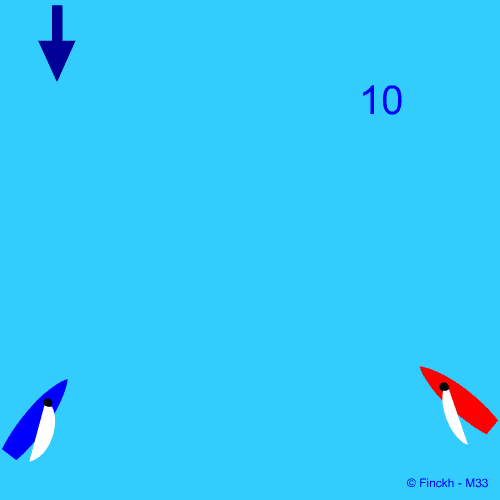 Blau wird wegen Verletzung von Wettfahrtregel 10 (Auf entgegengesetztem Schlag) und 14 (Berührung vermeiden) bestraft. Rot hat nichts getan um eine Berührung zu vermeiden. Da es dabei Schaden gab wird es wegen Verletzung von WR 14 (Berührung vermeiden) bestraft. |